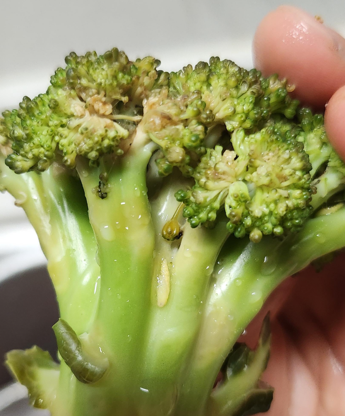 이제까지 마트에서 구매한 브로콜리만 먹다가 이번에 저희 밭에서 약 안치고 키운 브로콜리를 수확했습니다. 브로콜리 꽃잎사이에 벌레가 많다는 얘기는 알고 있었지만 마트 브로콜리에서는 한번도 본 적이 없기 때문에 몰랐는데 이번에 정말 브로콜리 벌레에 치를 떨었습니다.